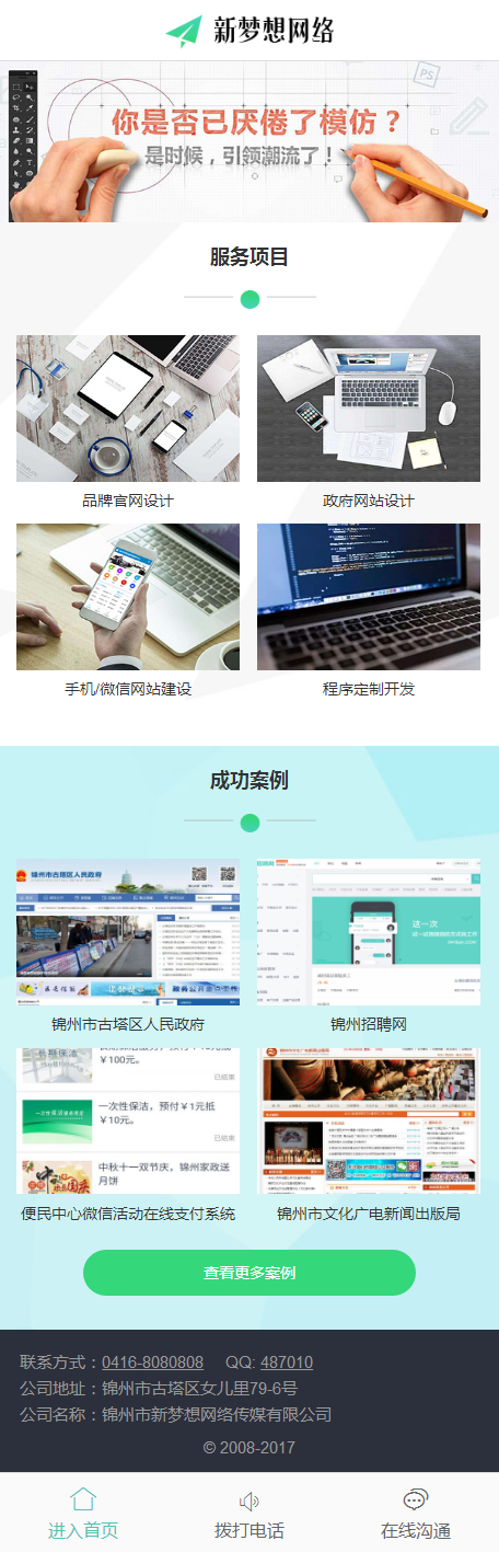 錦州市新夢想網(wǎng)絡(luò)傳媒有限公司成立于2008年,是立足于錦州的專業(yè)互聯(lián)網(wǎng)服務(wù)提供商,也是覆蓋遼西五市的互聯(lián)網(wǎng)企業(yè)。致力于為事業(yè)單位、政府機關(guān)、企業(yè)提供網(wǎng)站建設(shè)、微信平臺搭建、軟件開發(fā)和企業(yè)大型商務(wù)活動的策劃等服務(wù)。